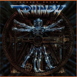 Esse é o álbum mais polêmico do grupo e um dos meus favoritos, lado a lado com Just a Game. O Triumph abdicou do sucesso dos álbuns anteriores, trocou de gravadora e, em uma viagem de Rik Emmett, construiu um álbum conceitual que mostrava o futuro da humanidade, narrando fatos sobre como os homens lutavam para conseguir sobreviver em um mundo cheio de novidades, como computadores, aparelhos celulares e naves espaciais. Um excelente trabalho, que demorou para ser absorvido pela crítica e pelos fãs, acostumados com as letras e temas adolescentes dos álbuns anteriores. A sonoridade, repleta de sintetizadores e eletrônicos, agradou à turma jovem americana, mas afastou os fãs antigos. Enfim, pelo menos mais dois clássicos: “Spellbound”, faixa que abre o LP com Gil cantando sua melhor composição desde “Rock and Roll Machine”; e “Follow Your Heart”, outra grande canção na linha AOR e também com Gil nos vocais. Das canções de Rik, a que mais se destacou foi justamente a peça clássica “Midsummer’s Daydream”, copiada e estudada por muitos garotos que estão aprendendo a tocar violão, e que antecede a bela vinheta “Time Canon”, onde barulhos diversos abrem espaço para minha canção favorita no LP, “Killing Time”, uma linda balada com vocais divididos entre Rik e Gil. O hard de “Cool Down”, com a introdução ao violão folk, e os teclados de “Rock Out, Roll On”, trazem novamente as variações de gêneros dentro de um mesmo álbum do grupo, assim como o blues oitentista de “Stranger in a Strange Land”, com muitas alavancas e bends, presentes também na ótima “Time Goes By”. O LP encerra-se com a linda instrumental “Little Boy Blues”, com Rik despejando sentimentos em sustains e bends sensacionais. Esse foi um dos primeiros álbuns da história a ser lançado em uma grande tiragem em CD. A capa apresentava o tema central do LP, com uma versão computadorizada do “Homem Vitruviano” de Leonardo da Vinci. A turnê de Thunder Seven foi recheada de efeitos computadorizados, lasers e um show de luz e fumaça. Gil, por exemplo, utilizou-se de baquetas iluminadas para executar seu solo. A gigantesca turnê culminou no álbum Stages, lançado em 1985. Os problemas internos começaram a aparecer nessa época, principalmente entre Rik e Gil. Esse foi o último grande álbum do Triumph, também o mais experimental da carreira do trio.