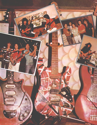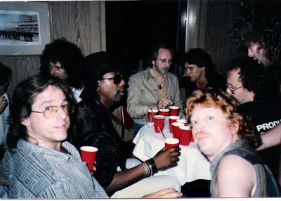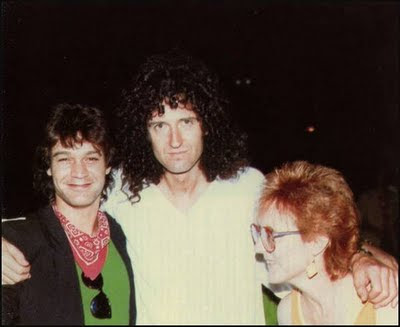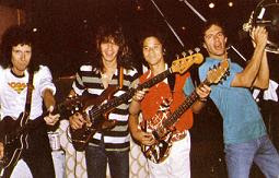 | Festa de lançamento de Star Fleet Project, contando, ao fundo, com May (esquerda), Van Halen (direita), John Entwistle (centro, ao lado de Eddie) e diversos convidados |