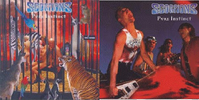 O Scorpions não precisou mudar a arte de sua capa em Savage Amusement (1988), porém, vamos combinar que essa capa é de gosto bem duvidoso. O mesmo acontece com as insossas artes feitas para Crazy World (1990) e Face the Heat (1993). Contudo, em Pure Instinct (1996), a imagem de uma família sem roupas, presa dentro de uma jaula e com diversos animais os olhando como se estivessem prontos para fazer uma lanchinho, acabou gerando uma nova capa com a banda, dessa vez não tão ruim assim. Na verdade a intenção da banda era mostrar uma inversão de papéis, onde os humanos estariam sendo observados pelos bichos como se os exóticos fossem eles.