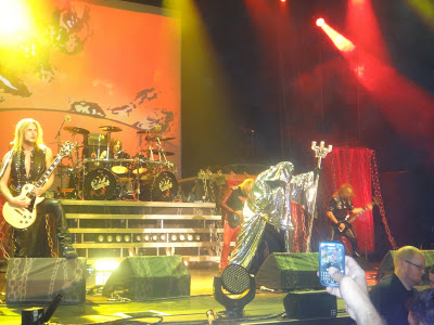 Mas o mais marcante para mim foi a atuação de Rob Halford. Não preciso dizer que ele cantou demais, soltou agudos altíssimos e foi muito simpático com o público, porém o motivo de esta ser a última turnê da banda está claro: as questões físicas de seu vocalista. Ele se movimenta devagar, com uma respiração tão profunda que parecia que tentava guardar energias para qualquer momento em que isso fosse necessário. Em alguns momentos, principalmente após cantar trechos mais altos, dava a impressão que ele estava com falta de ar. Notei também que ele ia para os bastidores em todas as situações em que ele tinha algum tempo. Daí, para minha surpresa, consegui vê-lo, por entre as cortinas desses acessos à parte de trás do palco, com uma máscara de oxigênio. E as impressões que tinha tido durante todo o show foram confirmadas. Este fato nos faz pensar novamente no processo que estamos vivendo de perdas de ídolos. As bandas clássicas dos anos 70 ou já acabaram, ou estão encerrando as suas carreiras, com turnês de despedida ou, em muitos casos, já não possuíem integrantes vivos. É bem provável que em alguns anos estejamos órfãos de ídolos, portanto é bom que essas oportunidades de presenciar bandas clássicas ao vivo não sejam desperdiçadas. Mas deixo claro que o fato de ele estar sofrendo as limitações impostas pela idade, não atrapalhou sua performance em nenhum momento.