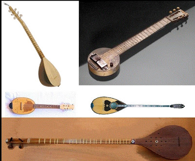| Primos próximos da Guitarra, evoluídos do Tanbur: Acima: Saz e Panchtar. No centro: Tamburitza e Bouzoki. Abaixo, o Setar |
