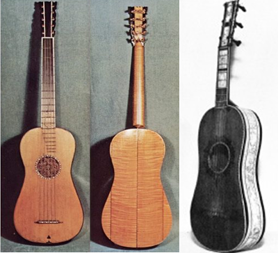 | A Quitarra de Stradivari (à esquerda), com as costas planas (centro) e a Quitarra de Thielke (direita), com cordas individuais |