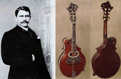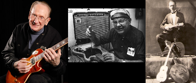 | Orville Gibson e o primeiro modelo com boca oval (acima); Les Paul, Leo Fender e O. W. Appleton (abaixo) |