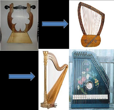 | Evolução da Khitara. Acima: a Khitara (esquerda) evolui para a Lira (direita); Abaixo: a Lira evolui para a Harpa (esquerda) e para a Cítara (esquerda). Nada de Guitarra saiu deste instrumento. |