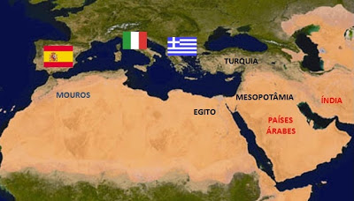 Agora, uma espécie de mapa das origens da Guitarra até chegar na Europa. Na figura acima, temos escrito em preto as regiões onde nasceram os primeiros instrumentos com cordas em formato similar com o que viria a ser a Guitarra. No caso o Egito, a Mesopotâmia e a Turquia. Nesses países, o Tanbur se consolidou como um instrumento popular, mas sofreu algumas modificações com o passar dos anos, o que ocorre nos países em vermelho (Índia e países árabes). Lá, os novos instrumentos são designados através da quantidade de cordas sobressaindo o Chartar (quatro cordas) que é levado para a Espanha através dos mouros (azul) e para o leste europeu por mercadores e viajantes (Grécia). Os Europeus criam a Chitarra e um novo país surge nesse mapa, de importância vital para que a Chitarra vire a Guitarra: a Itália.