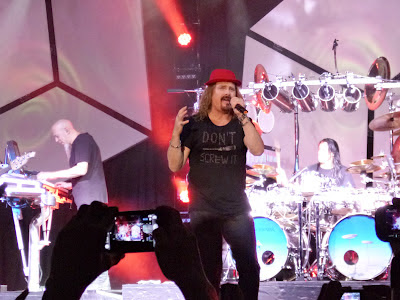 A nova “Outcry” e outro curto solo ao piano feito por Rudess precederam mais um grande momento do show, na forma da bela “Surrounded“, onde LaBrie até usou um chapeuzinho igual ao do personagem da capa do disco novo. Na sequência veio “On the Backs of Angels”, a primeira faixa de A Dramatic Turn of Events que ouvi. Ela ainda é a minha favorita deste disco, soando muito bem ao vivo e tendo uma calorosa recepção por parte do público.