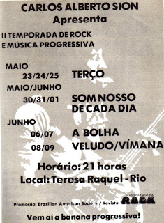 A Banana Progressiva foi outra maravilhosa reunião da nata rock brasileira e da MPB relacionada ao rock. Projetada para ser um evento multicultural (com música, exposições de artes plásticas, fotografia e cinema) e para acontecer como uma temporada, aconteceu de fato no Teatro da Fundação Getulio Vargas em São Paulo, em maio, organizado pela Trinka Produções, produtora que já organizava diversos agitos na capital paulista. Foram 4 noites de evento (29, 30 e 31/05 e 01/06/1975), começando numa quinta-feira. Na abertura do festival se apresentaram Veludo, Quarto Crescente (há outra banda com este nome nos anos 80, da qual fez parte o vocalista Percy Weiss, sem relação com esta), Bandolim e Som Nosso de Cada Dia. O segundo dia do evento foi a vez do grupo Montanhas, Edson Machado & A Rapaziada, Vimana e Burmah. Na noite seguinte, subiram ao palco Biscoito Celeste, A Bolha, Manito (já saído do Som Nosso de Cada Dia, se apresentando como artista solo) e Erasmo Carlo e Cia. Paulistana de Rock. E por fim, o domingo teve uma seleção maravilhosa de shows com Hermeto Pascoal, Barca do Sol, Jazzco e Terreno Baldio. A Banana Progressiva foi noticiada na época e musicalmente malhada pela crítica jornalística, que acusava os grupos de não terem originalidade e usarem fórmulas mal-copiadas de grandes grupos ingleses. O Festival foi bem sucedido em termos de público, porém a idéia de seguir como uma temporada de eventos não se firmou da maneira como a Trinka gostaria. Outras pequenas temporadas ocorreram no Opus 2004 e no Teatro Bandeirantes, todos em São Paulo, no segundo semestre de 75, mas ficou por ali. Recentemente, os registros em película da Banana Progressiva vieram a público, bem como o material gráfico foi digitalizado por um louvável esforço do selo PsicoBR; contudo, os áudios dos shows se perderam e na época já não tinham sido captados na íntegra (você pode conferir o histórico registro do festival aqui). A apresentação do Veludo na Banana Progressiva transformou-se em um disco lançado nos anos 2000 (não contém a íntegra da apresentação, mas boa parte dela), a partir do som capturado da plateia, com qualidade de som razoável e grande performance dos músicos, mostrando o calibre e a garra da banda.