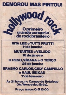 O empresário Nelson Motta (que já estava envolvido com o rock dos Brazões e dos Novos Baianos alguns anos antes, e apresentava o programa Sábado Som, na TV Globo) surge com o projeto “Hollywood Rock”, realizado no campo do Botafogo, na zona sul do Rio de Janeiro. Foram 4 fins de semana de som, cada um deles com atrações diferentes. O primeiro, em 11 de janeiro, teve como atração principal Rita Lee & Tutti Frutti. No dia 18 (coincidindo com o segundo dia do Festival de Águas Claras em Iacanga), estavam previstas apresentações do Veludo e dos Mutantes. O público, de aproximadamente 18.000 pessoas, lotava o espaço do campo. Após a apresentação do Veludo, os Mutantes sobem ao palco e logo são recepcionados por uma tempestade de verão, que destruiu o palco e acabou com a apresentação. Isso prejudicou muito a banda, que teve equipamentos danificados e os tirou da apresentação no Festival de Águas Claras (eles iriam direto do Rio para Iacanga, após o show, para se apresentarem no Festival de Águas Claras). No dia 25, as atrações eram O Peso, Vímana e O Terço (que tinha sido um dos headliners em Iacanga no fim de semana anterior). O Vímana foi prejudicado por uma falha no som durante parte do show e chegou a ser vaiado; já os dois outros shows levantaram a moçada. O derradeiro concerto da série recebeu dois artistas já históricos de nosso rock – Celly Campelo e Erasmo Carlos, além do emergente Raul Seixas. Erasmo Carlos vinha acompanhado de um supergrupo, batizado de Cia. Paulista de Rock, contando com os ex-Mutantes Liminha e Dinho Leme. Existe um “falso” registro em áudio de parte do festival, com as músicas de estúdio das bandas que se apresentaram, acrescidas de barulhos de platéia, e um registro raro em vídeo (chamado “Ritmo Alucinante”, cujo registro em vídeo pode ser visto aqui), infelizmente com baixa qualidade de som e imagem, de alguns trechos dessas apresentações, que pelo menos vale pra se ter uma idéia d’O Peso e do Vímana no palco. Houve tentativas da parte de Motta para levar o evento a outras capitais mas não deu certo. A Souza Cruz, patrocinadora do evento, inclusive, já tinha se comprometido com uma versão paulista do festival, que ocorreria no autódromo de Interlagos. Contudo, uma batida policial no hotel em que produção do evento estava hospedada encontrou drogas no local e a Souza Cruz retirou-se da jogada, inviabilizando o evento. Recentemente, foi descoberto no arquivo público do Estado do Rio de Janeiro o relatório de um agente do DOPS (Departamento de Ordem Política e Social) que esteve infiltrado no campo do Botafogo ao longo dos 4 fins de semana, tomando nota da loucura local. Uma de suas anotações destaca: “Inúmeros jovens de ambos os sexos apresentavam sinais de se encontrarem sob dependência psíquica; uns dançavam e contorciam-se no chão: olhos esgazeados, avermelhados, balbuciando frases desconexas.”