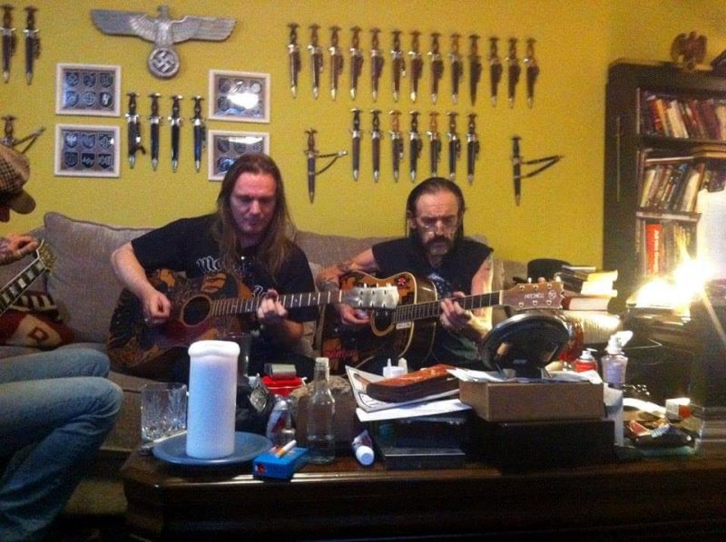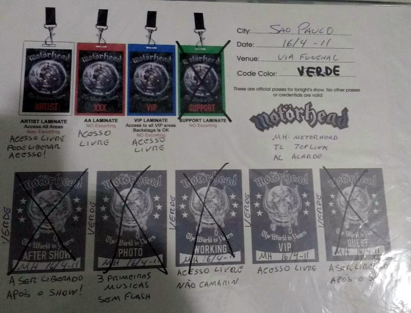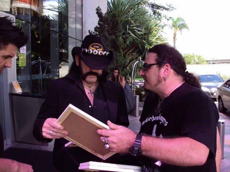 Sabendo da vinda deles em 2011, consegui agitar com Eddie Rocha, o tour manager, o Aftershow Pass para acessar a banda após o show. Meses antes, preparei com um amigo que tinha conhecimento de informática e uma máquina de fazer patches a confecção de 24 patches das unidades Waffen SS de combate alemãs da segunda guerra. Fiz quatro quadros com 6 patches cada. Descrevendo sob os patches qual unidade pertencia. Pessoas sabiam deste meu presente. Acabando o show, consegui entrar no camarim para entregar os quadros, mas infelizmente Lemmy não estava bem, e não ficou nem 40 minutos após o show acabar. Nem cheguei a vê-lo. Lá dentro, consegui algumas folhas tamanho A4 indicativas do camarim dele, informativo do tipo de passes do acesso a banda, umas coisas legais para a coleção. Mas saí bem frustrado do Via Funchal por volta das 23h30. Encontrei na saída a Paula Baldassari, radialista da Kiss FM, acho, na época, e que era contato meu no Orkut e sabia de meu presente e foi a única a ter contato com Lemmy ainda no Via Funchal. Quando me viu com os quadros não acreditou que eu não tinha conseguido dar. E ela havia comentado com Lemmy sobre os quadros e me disse que ele estava muito interessado. Me incentivou a ir ao Hilton Hotel para entregar e então para lá me dirigi. Chegando a meia noite. Nem sinal dele. Mas esperei pacientemente junto com outros três fãs, onde dois deles estavam nitidamente interessados em autógrafos e sair na foto, como um prêmio. As 4hs da manhã, Kevin Gilles, um inglês radicado no Brasil, vocalista do Devil Sins e que também era segurança da banda no Brasil, me garantiu que ia dar um jeito de fazer o encontro. Esperei onze horas pelo encontro. As 11 da manhã, esgotado, Kevin chegou e me explicou que Lemmy ia autografar só um item e decidi dar uma foto minha de 92 que mandei fazer e ele levou para o Lemmy autografar com dedicatória. Meia hora depois ele saiu apenas para as fotos para 4 fãs do lado de fora. Fiz um amigo lá e até hoje somos contatos no facebook. Ele tirou várias fotos entregando o presente a ele, onde conversamos sobre os patches brevemente. E a foto tão sonhada, para um quadro que mandei fazer. Imaginei que este presente pudesse aparecer algum dia em alguma foto, mas o antigo apartamento dele era apinhado de coleções. Ele mudou-se para outro apartamento, mais próximo ao Rainbow e toda aquela confusão do primeiro ficou limitada há umas adagas alemãs da segunda guerra na sala de estar dele. E sem mais nem menos, um dia um belga me marca em uma foto no facebook, onde havia uma foto da sala dele. E os quadros eram o único presente de um fã junto as adagas alemãs naquela sala. Quase tive uma sincope rsrsrsrsrsrrs… Vim a descobrir quem tirou as fotos e hoje é meu contato no facebook e instagram, a baixista do Nashville Pussy a época, Corey Parks. Era grande amiga de Lemmy e me enviou por mensagem várias fotos da coleção dele e dos quadros na sala. Inestimável! Para sempre em meu coração, eternizado em fotos. A consideração de Lemmy para com os fãs era algo inigualável.