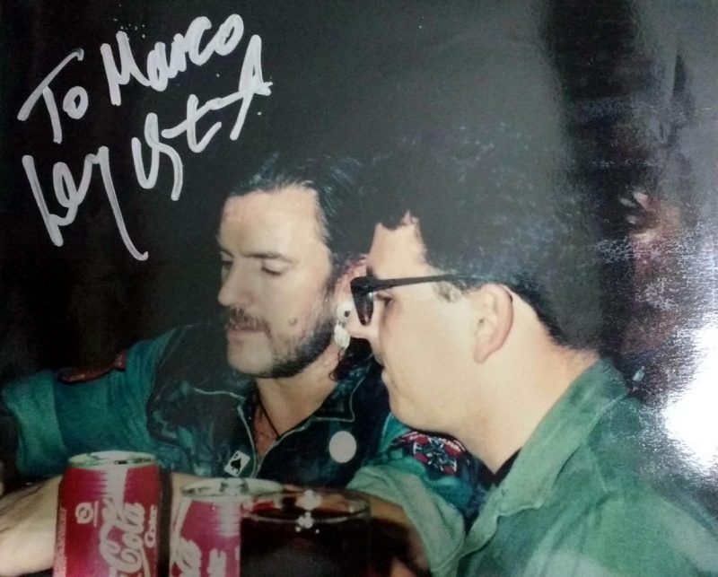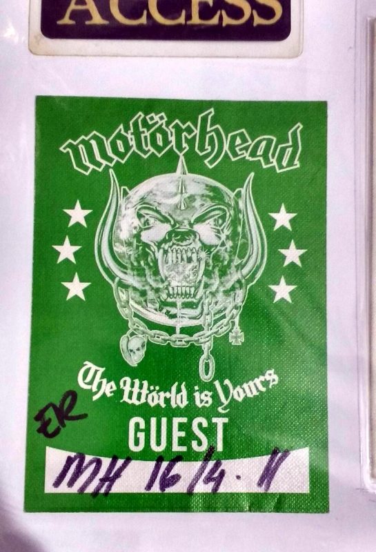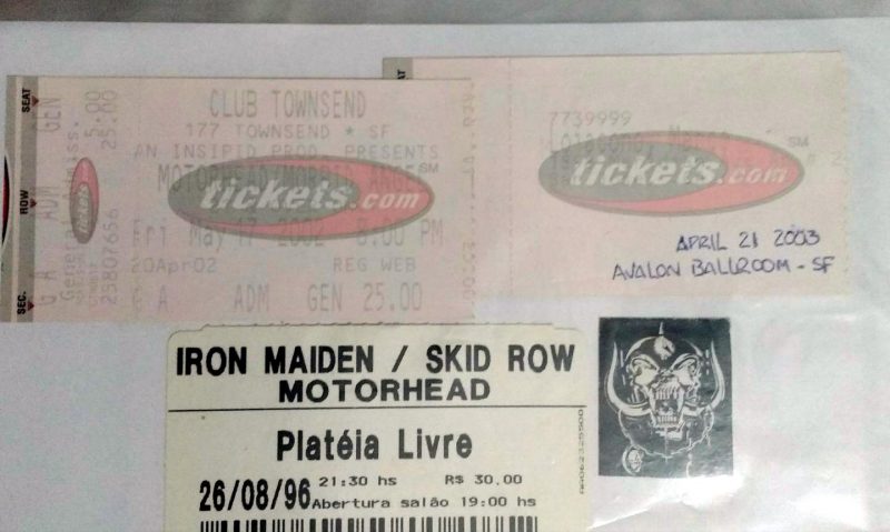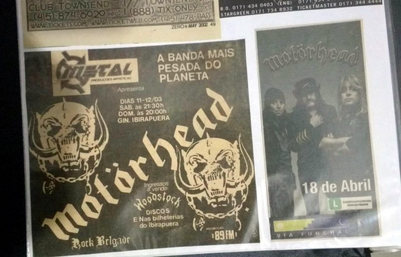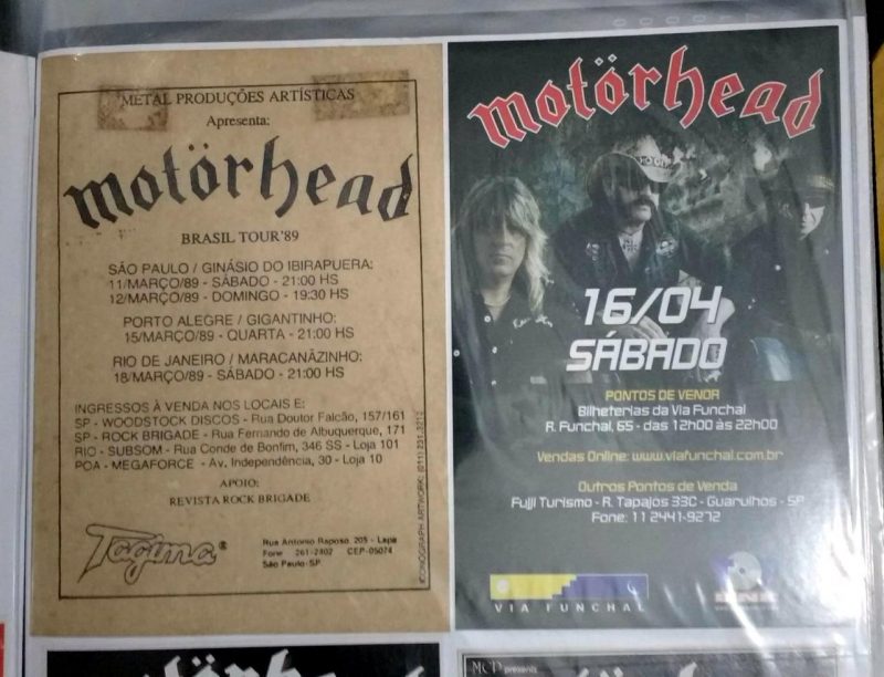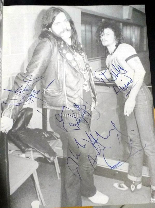 Tenho histórias alegres e tristes com relação à isto. A primeira visita deles em 89 já era esperada por mim ansiosamente, claro. Me pegou de surpresa o fato deles se hospedarem no hotel San Raphael no centro de SP e eu estar por lá coincidentemente a trabalho e com o primeiro livro que tive deles. E claro, a época não havia máquina digital ou celular. Fui ao hotel e consegui encontrar a formação a época, Lemmy, Animal, Wurzel e Campbell. Havia outro fã lá com máquina. Pedi a ele se ele podia tirar minha foto com eles e enviar a meu endereço e ele concordou. Tirei foto com Wurzel e Animal. Não consegui com Lemmy e Campbell, mas os quatro assinaram meu livro, que era sobre a historia da formação clássica. Uma foto de página inteira, mostrava o Animal e Lemmy, mas mesmo os outros não estando, eles assinaram. Fato triste? O cara nunca me mandou as fotos e justamente com os dois que já morreram também. A segunda vez em 92, consegui a tão sonhada foto com Lemmy, através do Pepinho Macia, filho do ex-jogador do Santos, Pepe que jogou com Pelé. Pepinho tem grande influencia no meio metal e acesso invariavelmente a membros de bandas diversas. Para esta foto, tive que me esconder ao fim do show atrás das caixas de instrumentos da banda, em um canto do antigo Olympia. Que aventura ver o caminho livre e abrir uma porta e dar de cara com pessoas conversando com Lemmy. Eu não falava nada de inglês mas o Pepinho agitou e consegui a tão sonhada foto, fora os autógrafos nos ingressos dos dois dias. A segunda vez que encontrei Lemmy foi em San Francisco, em 2002. Era o primeiro da fila pois cheguei cedo sem saber como funcionam as coisas por lá. Ninguém é apressado como o brasileiro. Na hora que supostamente iria abrir o teatro a moça avisou que iria demorar mais uma hora para abertura. Falei com o segundo da fila e fui procurar um banheiro em uma rua paralela ao teatro e quando adentro o bar dou de cara com Lemmy e mais três caras, jogando sinuca… absolutamente mais ninguém :D. Esperei a jogada dele terminar e falei com ele, que me atendeu de muita boa vontade. Conversamos por 10 minutos sobre o roadie brasileiro dele, o Rogério, e inclusive pegou na minha cruz de ferro para analisar. Que momento mágico. Pedi a foto, não quis ser aquele fã mala e tirei somente uma foto, a primeira da máquina de filme. Me despedi em êxtase. E no show no gargarejo completei o filme com mais fotos. Mandei revelar logo cedo no dia seguinte e adivinha qual a única foto que não saiu? Não virei o rolo o suficientemente. Chorei por uns 3 dias e ate hoje me entristeço com a situação. Ficou somente em minha memória :/. Em 2007 encontrei o Mikkey Dee no Manifesto Bar onde tirei foto com ele. Lemmy não apareceu. Em 2009, consegui autografo dos três no Via Funchal e consegui dar uma camiseta com tema da segunda guerra ao Lemmy. Não foi permitido tirar fotos com eles. Mas enquanto eu tinha os ingressos sendo autografados, meu irmão tirou as fotos deles. Infelizmente a foto minha entregando a ele a camiseta e cumprimentando-o foi atrapalhada por um outro fã, só saindo meu braço cumprimentando Lemmy. Em 2011 rolou a terceira foto com Lemmy , que conto na próxima pergunta.
