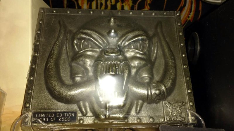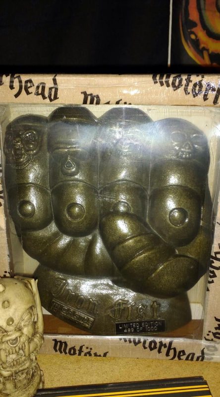 Uma situação curiosa e embaraçosa a princípio foi um picture disc do Motörhead que vi no eBay, Deaf Forever, em que não prestei atenção e o cara não aceitava Paypal, somente money order. E para piorar o cara não falava inglês. Foi complicado. Tive que contatar um fã alemão na época para ajudar na transação. E dois itens raros que tenho, como o Iron Fist (é um punho realmente em ferro, o mesmo da capa do Iron Fist) e uma placa de ferro comemorativa, da Griffin Records. Nunca iria conseguir arrebatar em leilão, mas este alemão da época (não é o mesmo que me ajuda atualmente), me contatou para oferecer estes itens, de outros alemães e confiar nele e comprar às cegas. Mas deu tudo certo, felizmente.