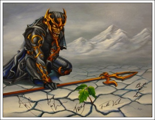 2. Finalmente minha banda preferida do Metal apareceu nesta segunda parte dos mascotes mais amados do estilo, que é o Judas Priest. Concordo plenamente que o Painkiller seja o mais conhecido mascote criado pela banda, que aparece na capa de seu mais importante trabalho até hoje (lançado em 1990), só que, como eu sou um apaixonado pela fase oitentista da banda, o meu favorito deles é o Metallian, que estampa a capa daquele que eu considero o melhor trabalho musical da banda: Defenders of the Faith (1984), seguido de perto pelo anterior, o Hellion (de Screaming for Vengeance, 1982).