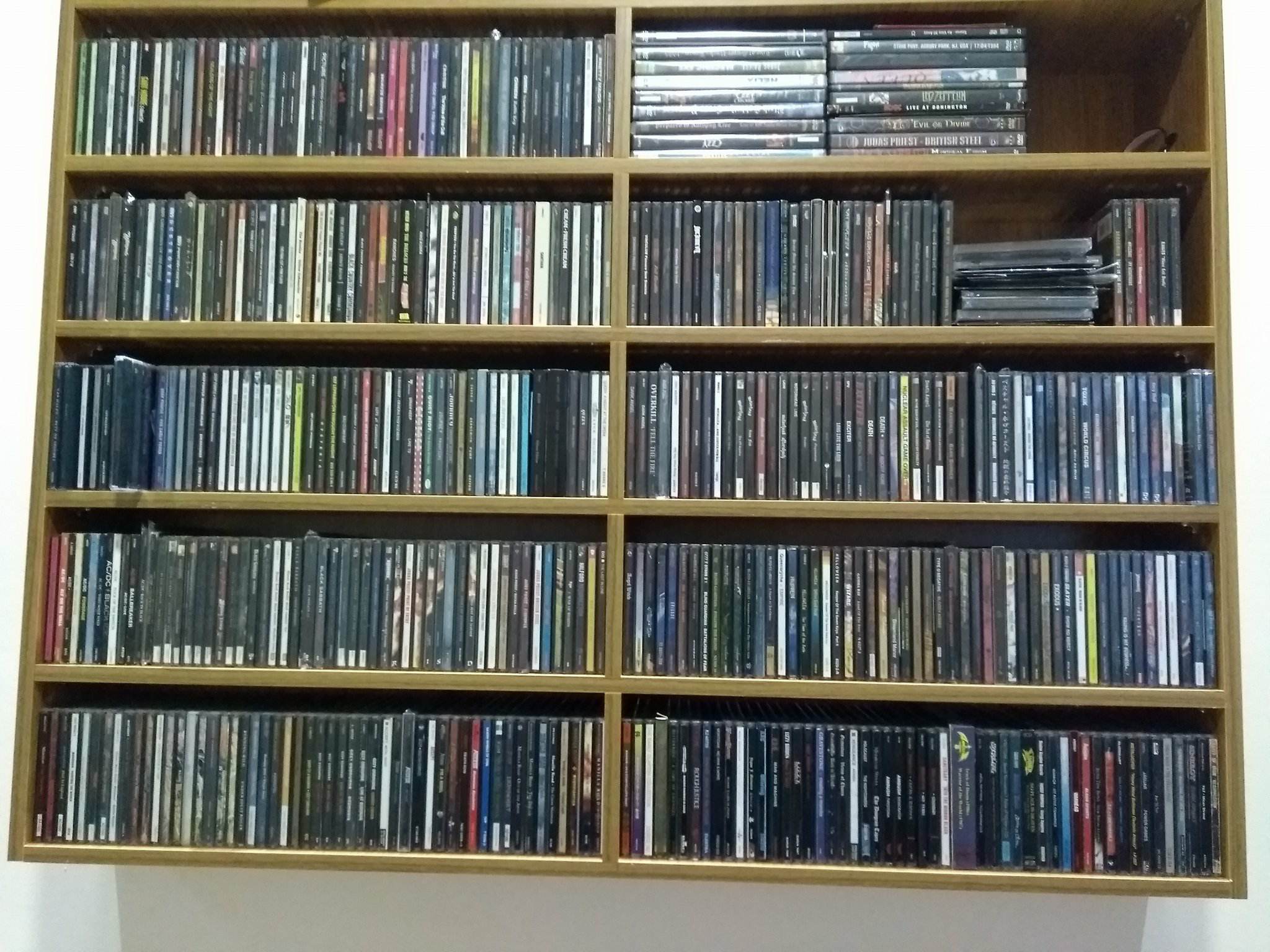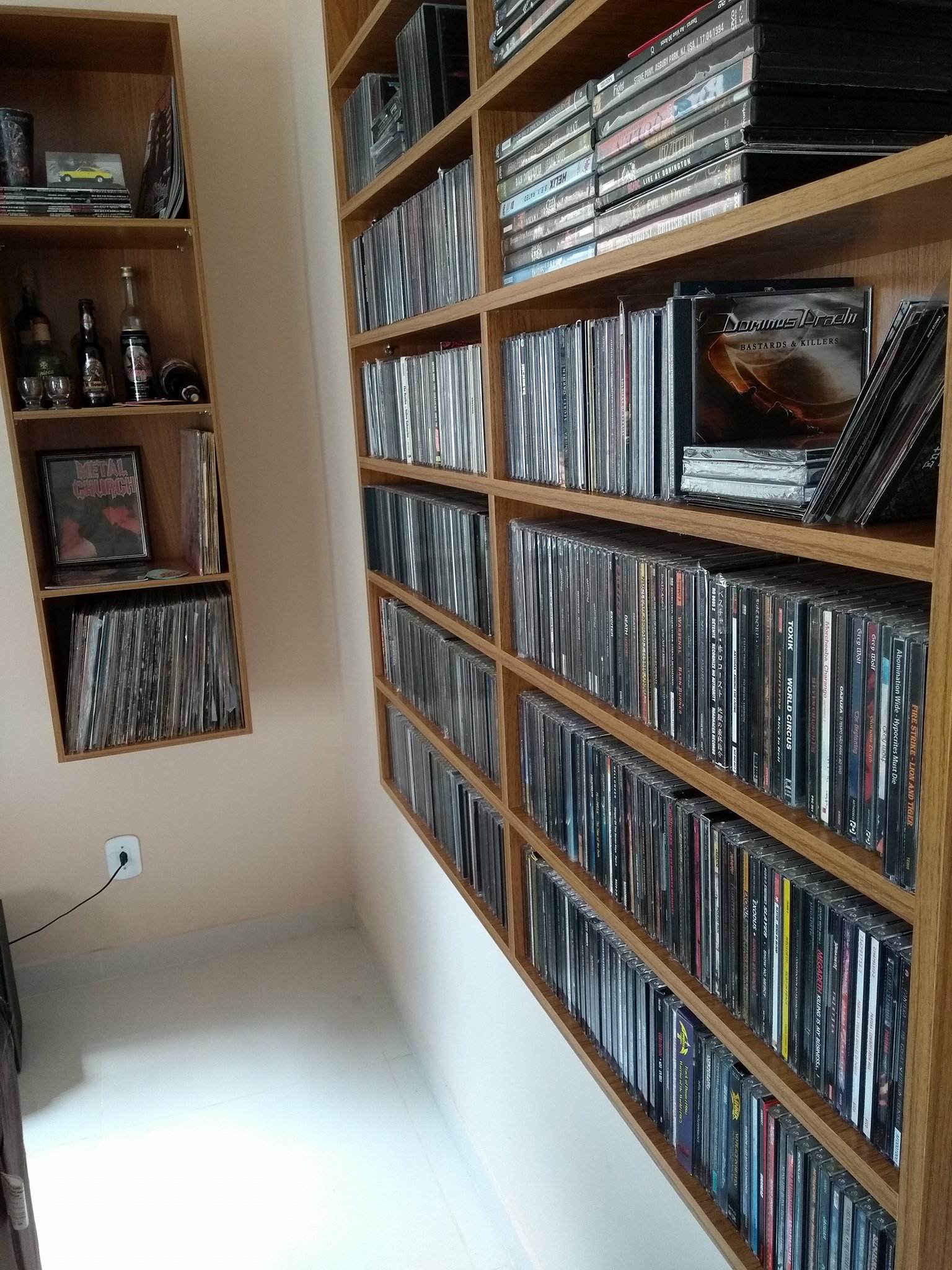 A coleção não é grande igual as coleções fantásticas que vejo!  CDs em torno de 515 e mais 100 LPs. Foram contados na última organização. E vem chegando mais!