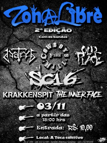 Dia 03 de novembro a cidade de Goiânia terá uma reunião de 06 grandes bandas locais se apresentando no “A Toca Coletivo”. O evento “Zona Libre” chega a sua segunda edição e tem como atrações as bandas Krakkenspit, Old Place, SC16, The Innerface, Dyatryb e Cowboys From Hill.