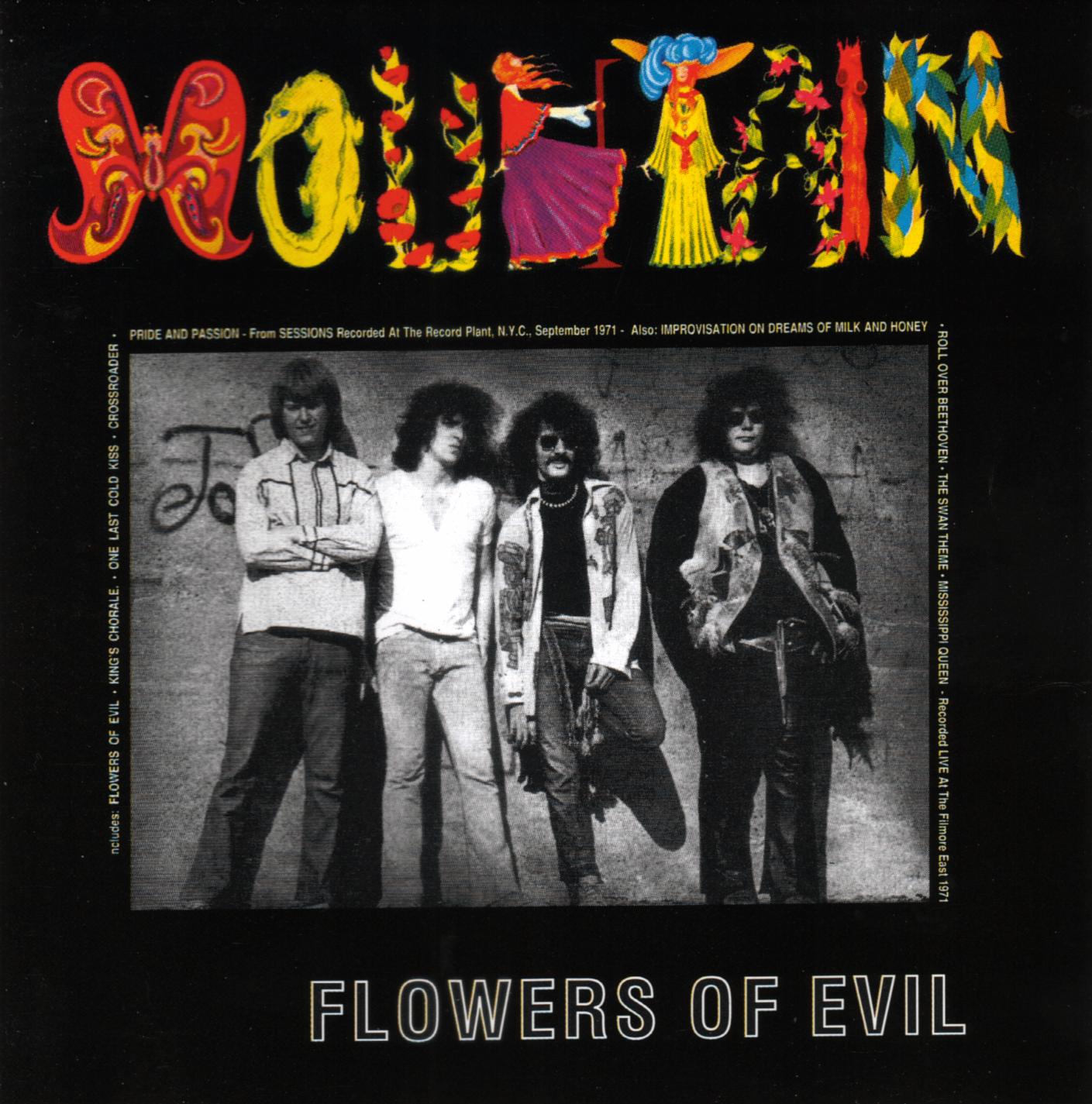 Flowers of Evil é fracionado entre o estúdio e o palco e de certa forma mostra a banda um pouco desgastada, sem o brilho de outrora e com uma maior presença de Felix Pappalardi nos vocais. Não é o exatamente o caso da faixa abertura, que batiza o álbum, uma composição empolgante com os vocais guiados quase que 100% por Leslie West e o piano esperto de Steve Knight. “King’s Chorale” e “One Last Cold Kiss” tem presença intensa do piano de Steve Knight, sendo a primeira inteiramente instrumental e a segunda cantada por Pappalardi. A coisa volta a esquentar com “Crossroader”, novamente cantada por Pappalardi, mas é nítido perceber que suas versões ao vivo davam a potência necessária para os riffs e solos suculentos da guitarra de Leslie West nesta música. “Pride and Passion” tem bons momentos, mas é exagerada e mostra o Mountain investindo novamente na seara da mini-suíte “Nantucket Sleighride”, contudo, sem bons ganchos. O lado B do álbum é ocupado por registros ao vivo da banda no Filmore East (Nova York) em 1971. Um meddley humildemente chamado de “Dream Sequence”, emenda a releitura de “Roll Over Beethoven” de Chuck Berry com uma improvisada versão de “Dreams of Milk and Honey” e apavora os ouvidos incautos! E para encerrar, o grande hit da banda, “Mississipi Queen”, do mesmo show.
