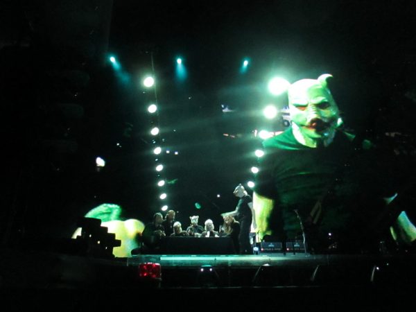 Musicalmente, “Dogs” foi interpretada fielmente a versão original. Os solos de guitarra, a participação dos teclados, tudo esteve muito bem encaixado. A sacanagem unindo os três animais do disco, com a ovelha servindo champanhe para os porcos, e os cães latindo ao fundo, ficou muito legal, e claro, Waters fantasiado de porco, dizendo que os porcos governam o mundo, e depois mandando um belo “Fuck the Pigs” (já sem máscara) foi de tirar o sarro. “Pigs (Three Different Ones)” foi mais centrada em “homenagear” Donald Trump. O uso do vocoder por parte de Dave me fez viajar no tempo, quando ouvia Animals deitado no meu quarto delirando com aqueles efeitos. Só essas duas faixas já valeram a ida nos dois shows, seja pela música, ou pela beleza que foi a criação da usina no telão.