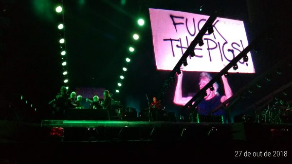 • O show de Curitiba, para mim, teve muito mais tesão por parte de Waters. Em Porto Alegre, ele pareceu mais frio, ou conformado com a eleição do Bolsonaro. Em Curitiba, ele ainda tinha um gás para queimar, e foi bem mais interativo com a plateia no sentido de tentar fazer algum eleitor repensar o voto.