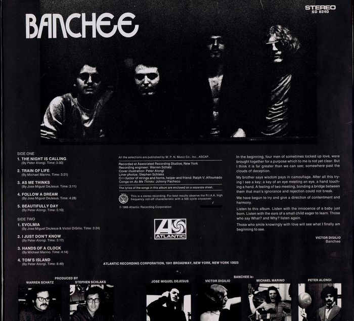 O injusto contar do tempo tratou de pôr na gaveta pérolas e mais pérolas da música. E continua colocando. Em mais um capítulo revirando tralhas, trazemos hoje Banchee, formidável banda dos EUA. A banda foi formada como um quarteto de imigrantes (portugueses e italianos) dos arredores de Nova York. Eram eles – Peter Alongi e José Miguel de Jesus nas guitarras, Victor William Digilio nas baquetas da bateria e Michael Gregory Marino no contrabaixo.