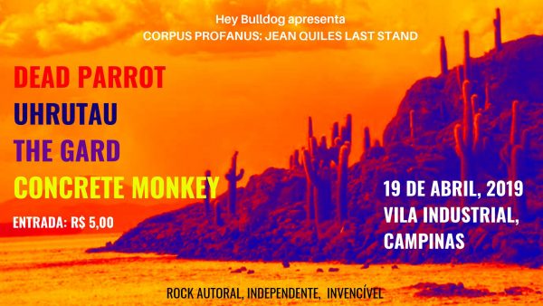 Dia 19 de abril, sexta-feira, será um feriadão nacional e nada melhor que aproveitar essa data para curtir eventos regados à boa música, ou melhor, a música pesada nacional. Pensando nisso, a cidade de Campinas/SP realiza o evento “Corpus Profanus: JeanQuiles Last Stand”, que contará com 04 bandas, sendo três locais e uma de São Paulo. Um dos destaques fica por conta da banda de Classic/Hard Rock, The Gard, que leva ao público um set para celebrar o primeiro ano de aniversário do lançamento do álbum Madhouse e o novo single “Plastic Man”. Outros destaques ficam por conta das bandas Dead Parrot, Concrete Monkey (SP) e Uhrutau. As bandas se apresentam a partir das 21h00 e os ingressos terão valor simbólico de apenas R$5,00.