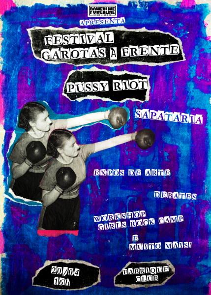 O Garotas à Frente é um festival multimídia que celebra a participação ativa das mulheres em todos os âmbitos da sociedade. Mais do que feministas, as mulheres de hoje são seres políticos que reivindicam e ocupam os lugares que escolhem no mundo, questionando papéis de gênero tradicionais, posições de trabalho onde são minoria e se expressando sem pudores através de moda, cultura e artes. O festival terá shows, exposição e workshop de produção de lambe e stêncil ministrado pelas garotas do Girls Rock Camp Brazil. O evento leva o nome do livro que será lançado pela Powerline, Garotas à Frente, tradução do livro Girls To The Front de Sara Marcus que conta a cena riot girl americana encabeçada pelo Bikini Kill. No dia também rolará o lançamento do livro Read and Riot, da Nadya Tolokonnikova, umas das fundadoras do Pussy Riot.