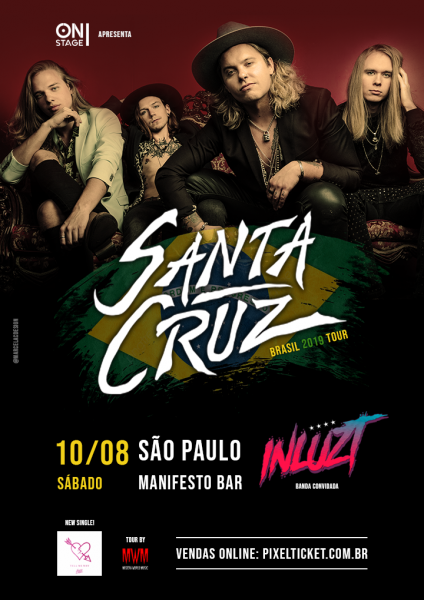 Sensação do hard rock/glam metal da Finlândia, o Santa Cruz logo extrapolou as fronteiras escandinavas e ganhou fama ao redor do mundo já com o disco de estreia, Screaming for Adrenaline (2013). Atualmente, com nova formação, experiência de ser atração principal de festivais europeus, dois singles recém-lançados e uma sonoridade pesada que resgata elementos tradicionais do gênero, a banda enfim estreia no Brasil numa mini-tour de três shows, com São Paulo na rota, dia 10 de agosto. O show, no Manifesto Bar, terá a abertura da local Inluzt. A produção é da Onstage Agência.