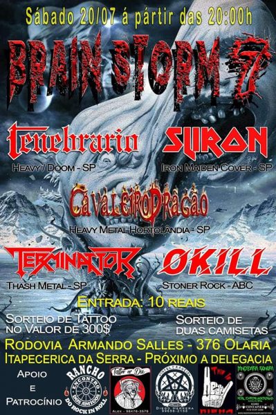A banda Okill participa neste sábado, dia 20 de julho, do Brain Storm Metal Fest 7, em Itaperica da Serra, juntamente com Tenebrario, Sliron, Cavaleiro Dragão e Terminator. O ingresso para o evento dá direito a um drink da casa, além de concorrer a um sorteio de uma tatuagem no valor de R$300,00, dois piercings, cds e camisetas. Para este festival, o Okill estará vendendo seu novo modelo de camiseta, no valor de R$40,00, disponível nos tamanhos P, M, G e GG. Além dos shows, todo merchandising está disponível na página oficial do grupo.