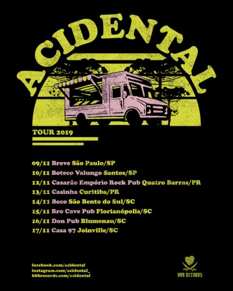 Depois de lançar, em março deste ano pela Hearts Bleed Blue (HBB), a compilação Grandes Momentos 2015 – 2018, a banda Acidental anuncia uma série de shows de divulgação do disco. A turnê passará pelos Estados de São Paulo, Paraná e Santa Catarina. “A banda fez seu primeiro show em 2017 e de lá pra cá, a gente foi acertando muita coisa. Acho que agora teremos um show mais completo, mais cheio, com mais contrastes entre momentos pesados e momentos calmos. Teremos mais barulho também! Estamos há um ano sem tocar e com saudade dos shows, estamos com força total”, revela o vocalista e guitarrista Alexandre M.