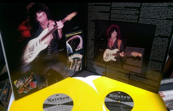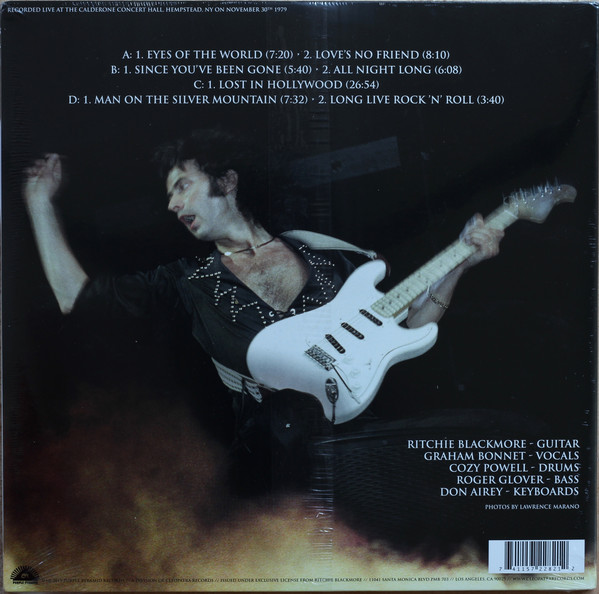Contando em seu line-up, à época, com o baterista Cozy Powell, o tecladista Don Airey e o cantor Graham Bonnet (que havia substituído Ronnie James Dio alguns meses antes, e registrado o disco Down To Earth naquele mesmo ano), além dos citados Blackmore e Glover, e impulsionado pelo sucesso do single da canção “Since You’ve Been Gone” (sexto lugar na Inglaterra e presente no Top 100 dos Estados Unidos), o grupo fazia sua mais bem sucedida excursão ate então, em termos financeiros e de reconhecimento, nos Estados Unidos (curioso saber que parte dela foi como grupo de abertura do Blue Öyster Cult, o que nos dá uma ideia do “tamanho” do Rainbow no país à época), e o concerto registrado neste disco mostra uma banda já bastante entrosada e adaptada ao material executado, “azeitada” pelo longo período na estrada com seu novo “lead singer“. Infelizmente, a qualidade sonora do álbum em questão é bastante ruim, com o som muito baixo e abafado, os pratos de Powell “sibilando” constantemente nas caixas de som (dá a impressão de um rádio FM ligeiramente fora da sintonia ideal, consigo me fazer entender?), a voz de Bonnet “abafada” em meio aos demais instrumentos e o baixo de Glover por vezes quase sumido na mixagem. Seria possível imaginar que Blackmore e a gravadora simplesmente pegaram um dos muitos bootlegs do show existentes por aí, colocaram algumas fotos do guitarrista nas capas externas e internas (à exceção das capas de três singles da época, a imagem do “poderoso chefão” do Rainbow é a única de um membro da banda a aparecer no disco) e “soltaram” o mesmo no mercado em uma versão diferente das anteriores. Mas um detalhe nos faz pensar diferente: em todas as faixas, a guitarra do Sr. “Ricardinho Maispreto” está alta e cristalina, brilhando à frente da massa sonora dos demais instrumentos, o que nos mostra que alguma coisa em termos de mixagem deve ter sido feita antes da “oficialização” do concerto ao público em geral. Claro que, para os colecionadores de verdade, acostumados a bootlegs mal gravados cujo valor histórico é muito maior do que a qualidade cristalina das gravações digitais atuais, esta alegada “falta de qualidade” na gravação não chegará a atrapalhar muito a audição (eu, por exemplo, tenho discos não oficiais em meu acervo muito mais difíceis de ouvir do que estes, e não me furto de escutá-los e apreciá-los com o mesmo entusiasmo que um disco oficial “ao vivo” lançado pelos artistas), e, lá pela terceira ou quarta música do álbum, este fator já não será mais um problema aos ouvidos menos sensíveis.