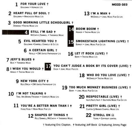 A fase Clapton é a mais bem representada. Aqui estão “A Certain Girl”, “Boom Boom”, “For Your Love”, “Good Morning Little School Girl”, “Heart Full Of Soul” e “I Wish You Would”. É a fase “adolescente” dos britânicos, voltados para o rhythm ‘n’ blues, e que fez o Deus da Guitarra Clapton pedir o boné devido ao sucesso de “Good Morning Little School Girl”. Ao ouvir essas faixas, o mais legal de tudo, além da jovialidade do quinteto formado por Clapton, Keith Relf (vocais, harmônica), Chris Dreja (guitarra base), Paul Samwell-Smith (baixo) e Jim McCarty (bateria), é que aqueles solos inspirados de Clapton nas épocas de Cream, Derek and the Dominoes, Blind Faith, …, já começavam a ser moldados lá no distante 1965. As letras juvenis de “A Certain Girl”, “Boom Boom”, a citada “Good Morning Little School Girl” e “I Wish You Would” causam uma risada gostosa, e musicalmente, é bom ouvir um rock simples e bem tocado de vez em quando. Destaque maior para “Heart Full Of Soul”, com um riff certeiro e um solo simples mas que levanta defunto.