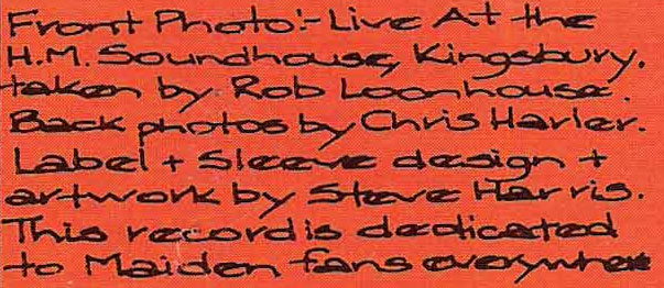 Parece que Harris fez tudo nesse EP, mas (e me corrijam se eu estiver errado) um designer normalmente não produz boa parte do conteúdo de capa. Tirando as fotos que, é claro, são de terceiros, o que Harris produziu foi: “Label” que é a arte do miolo do vinil, “Sleeve design” que é a disposição na capa dos elementos pré-criados (o logo Iron Maiden, as fotos, a fonte estilo Monotype Corsiva do título principal e o nome das faixas), e “Artwork” os textos e linhas remanescentes feitos à mão pelo baixista (exceto o texto de Neal Kay).