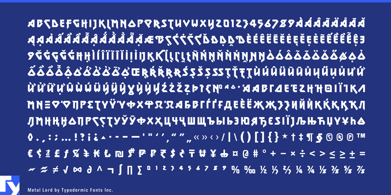 Metal Lord foi completamente redesenhada, espaçada e ajustada. É um pouco mais pesada do que costumava ser e, graças à descoberta de material de referência adicional, tem um design ligeiramente diferente. A versão original da Metal Lord foi vagamente extrapolada a partir das letras no logotipo do Iron Maiden usando os poderes da imaginação[…]. Mais tarde, descobri que a mesma fonte foi usada em 1976 para o pôster do filme de David Bowie, The Man Who Fell to Earth, bem como na capa de um livro imobiliário de 1979. Com esses recursos extras, consegui reunir uma representação melhor desta fonte. Ainda não consegui descobrir quem desenhou a original. – dafont.com/metal-lord.font