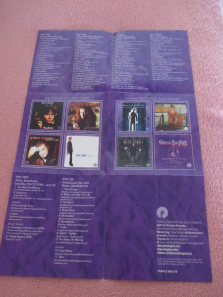 O terceiro CD nos mantém na Escandinávia, com o Show de Göteborg, Suécia, no Zoo Club, em 10 de setembro de 1993. O time que acompanha Hughes é praticamente o mesmo do CD 2, com exceção da bateria, agora com Hempo Hildén empunhando as baquetas. No track list, apresentações de canções que fariam parte de From Now On, o qual foi lançado em 1994, as quais são “Liar” e “Lay My Body Down”, que pega uma plateia bastante receptiva para as novas canções. “House of the Rising Sun” está novmente no track list, mais próximo a versão do Animals, e claro, Deep Purple (“Gettin’ Tighter”, “This Time Around” e “You Keep On Moving”) e Hughes/Thrall (“Coast To Coast”e “I Got Your Number”), além da revisão de “Georgia On My Mind” na mesma linha do show de Börlange. Novamente a qualidade de gravação é muito precária, com teclado e baixo inaudíveis, mas os vocais de Hughes estão perfeitos, assim como guitarra e bateria. Ficaram de fora do CD três canções que pertenceram ao track list apresentado (“Burn”, “Muscle and Blood” e “Smoke on the Water”), e assim, para fechar o CD, temos como bônus cinco canções de uma apresentação no The Cathouse, em Glasgow, Escócia, no dia 08 de novembro de 1995, na turnê de Feel, com “Muscle and Blood”, “This Time Around” (com a plateia cantando em uníssono, de forma emocionante) e “You Are The Music” das bandas que Hughes passou, e “Big Time” e “Talkin’ to The Messiah”, pertencentes ao álbum que estava sendo promovido na época. Não há informação dos músicos que acompanham Hughes aqui, mas através do site oficial de Hughes, encontrei o time com Glenn Hughes nos vocais, George Nastos (guitarra), Dave Patton (guitarra), Ruben Voltiera (teclados), Paul Kirkham (baixo) e Glenn Deitsch (bateria), e a qualidade de gravação é ainda pior que o show de Estocolmo, muito abafada, valendo apenas pela raridade de se ouvir Hughes ao vivo com essa formação. Estas cincos canções apareceram como bônus no bootleg A Dino in Gino, cujas canções “oficiais” são exatamente as que estão no quarto e quinto CDs desse box.