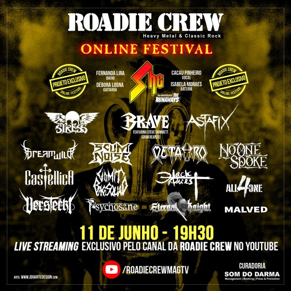 A revista Roadie Crew, em parceria com a produtora Som do Darma, apresentou na sexta-feira, dia 11 de junho, a décima-quinta edição do “Roadie Crew – Online Festival”. O evento online, realizado mensalmente, deu continuidade à sua missão de celebrar e promover o trabalho das bandas brasileiras e fortalecer a cena do heavy metal nacional, sempre com transmissão “Streaming-Live” exclusiva pelo canal oficial da Roadie Crew no Youtube. Até aqui, mais de 200 bandas já passaram pelo festival e centenas de outros grupos aguardam para se apresentarem em futuras edições. O “Roadie Crew – Online Festival” tornou-se a principal referência na fruição da cena brasileira de heavy metal que é, quantitativa e qualitativamente, uma das mais relevantes do mundo.