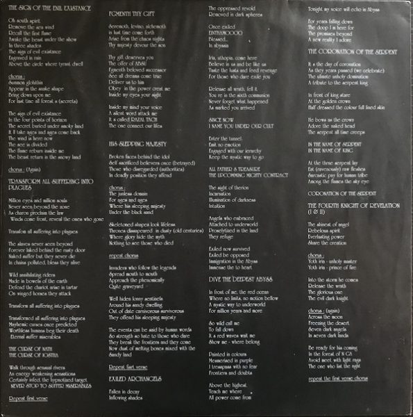“Dive the Deepest Abyss” mostra um Rotting Christ já em seu primeiro álbum full lenght, com vontade de fazer diferente da maioria das bandas de Black Metal. Teclados em destaque, em meio a riffs sujos, pesados e agressivos, torna-se uma característica bastante explorada ao longo dos anos pelo grupo. Além disso, contrasta-se com os riffs mais agressivos do início da música, partes de guitarra mais trabalhadas, apresentando ótimas melodias. “Coronation of the Serpent” já se inicia de forma bem característica ao Black Metal, se credenciando também como uma das faixas mais pesadas de todo o disco. Partes solo de guitarra desta vez são mais presentes e mais destacadas na mix, contribuindo e muito com o produto final. Os vocais além de apresentarem o já conhecido gutural, mostra algumas partes mais “faladas”, destacando um tom ainda mais sombrio à faixa. A bateria em alta velocidade também é um grande destaque e para coroar “Coronation of the Serpent” como uma das melhores faixas do álbum, um teclado que mais parece ter saído das trevas, acompanha de forma sublime a bateria.