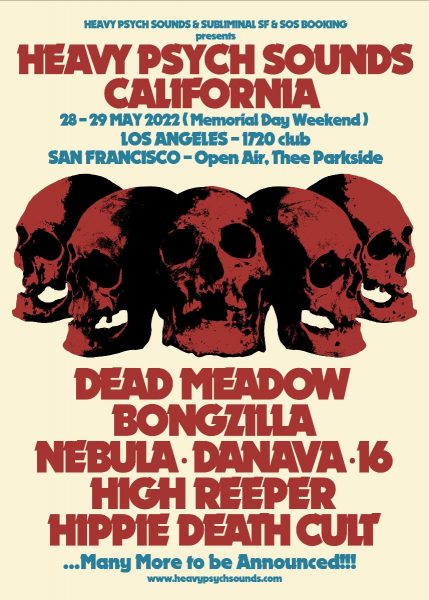 US heavy psych legends Dead Meadow will headline both events hand in hand with weed metal icons and recent HPS signees Bongzilla. Joining them will be West Coast stoner rock pillars Nebula and Danava, L.A. prolific sludge unit -(16)-, as well as HPS bands High Reeper and Hippie Death Cult. The festival will take place over the Memorial Day weekend as an indoor event at 1720 Club in Los Angeles, and as an open-air event at Thee Parkside venue in San Francisco.