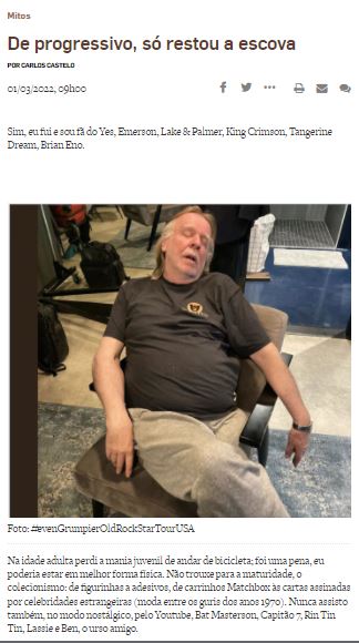 Como fãs que somos, temos frequentemente o hábito de levar nossos gostos, estilos e ídolos a sério demais. A maioria das tentativas de dar risada desses assuntos constrange os mais aguerridos. Contudo, alguns pontos da crônica de Castelo me fizeram refletir e traçar essas linhas. O cronista afirma em seu texto que seu gosto pelo rock progressivo se mantém com o passar do tempo, mesmo hoje ele reconhecendo que o estilo é exagerado, passível de “cancelamento” e até cafona (sentiu vergonha entre seus colegas por ter ido ao show de Rick Wakeman no Brasil nos anos 70), sendo impossível de ser assimilado pelas novas gerações. Todavia, o ponto nevrálgico de seu humor se assenta em cima de ver fotos de seus ídolos do passado (exemplificando novamente a partir de Rick Wakeman) tal como ele próprio é hoje – de altivos e pretensiosos jovens para velhos barrigudos e aparentemente acomodados.