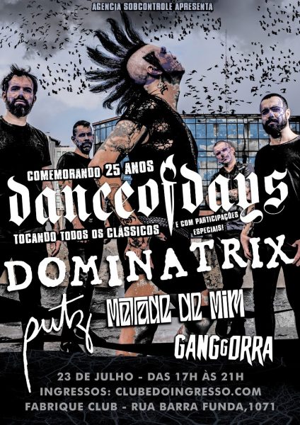 O Dance of Days, após dois anos longe dos palcos, celebra 25 anos em um show especial na capital paulista neste sábado, 23 de julho, no Fabrique Club. O evento como convidadas as bandas Dominatrix, Putz, Metade de Mim e Ganggorra. A realização é da Agência Sobcontrole. O Dance of Days é a resistência personificada do punk hardcore nacional, materializada em 25 anos de uma intensa história, repleta de vitórias, dramas, tensões e transformações. Da segunda metade da década de 1990 até os dias de hoje, a vocalista Nenê Altro compartilha emoções e lições de vida de peito aberto, olhos nos olhos e em diálogo constante com o íntimo de seu fiel público. Os ingressos estão no último lote.