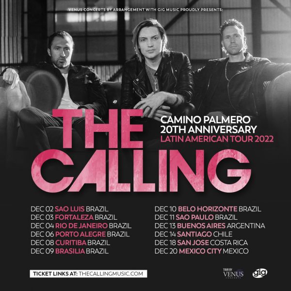 O The Calling retorna ao Brasil em dezembro deste ano para mais uma série de shows recheados de hits que marcaram a geração dos anos 2000. O novo giro da banda norte-americana desta vez é ainda mais especial: é a celebração dos 20 anos do premiado disco de estreia, Camino Palmero! O show de São Paulo acontece no dia 11 de dezembro, no Carioca Club. Nesta nova turnê, o The Calling também toca em São Luiz (Maranhão, 2/12), Fortaleza (Ceará, 3/12), Rio de Janeiro (RJ, 4/12), Porto Alegre (Rio Grande do Sul, 6/12), Curitiba (Paraná, 8/12), Brasília (Distrito Federal, 9/12) e Belo Horizonte (Minas Gerais, 10/12). A turnê ainda passa Buenos Aires (Argentina, 13/12), Santiago (Chile, 14/12), San José (Costa Rica, 18/12) e Cidade do México (México, 20/12).