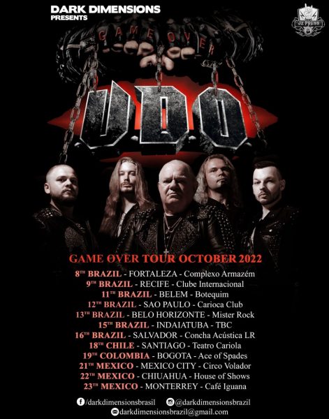 Com mais de 40 anos de carreira, uma extensa e consistente discografia com mais 30 álbuns lançados incluindo nessa lista dezenas de clássicos do metal mundial com a banda ACCEPT nos anos 80 e 90, uma bem sucedida carreira como sua banda U.D.O, projetos paralelos, lançamentos solos etc, Udo Dirkschneider retorna a América Latina trazendo sua voz emblemática, rasgada e potente para uma série de shows que, por conta da pandemia de #covid19, sofreram adiamentos nos últimos dois anos. Com a retomada dos shows devido aos índices da pandemia terem diminuído drasticamente, as portas do Brasil foram reabertas para U.D.O e cia poderem, enfim, divulgar seus últimos trabalhos, especialmente Game Over, o foco dessa nova turnê sul-americana. Mesmo com o nome Game Over, o baixinho está bem longe de aposentar-se e provará isso com muito vigor, energia e metal (como se alguma vez ele necessitasse provar algo, não é mesmo?) nos palcos latinos, prometendo a seus fãs uma experiência única e imersiva dentro do que há de melhor dentro do Heavy Metal clássico germânico!