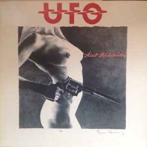 Lançado em novembro de 1985, Misdemeanor pode ser tratado mais como um disco solo de Mogg do que da carreira do UFO. É um álbum marcado por canções de refrãos repetitivos, uma bateria quadrada como manda o som dos anos 80, e muita fritação nos solos de Tommy M, além da forte presença de sintetizadores. São raros os momentos dignos de nota aqui, vide o bom riff de “Meanstreets”, a chiclete, mas boa, “Blue”, trazendo um bom trabalho de construção musical, ou a surpreendente “Wreckless”, única com uma pegada de baixo e bateria lembrando a dupla Way/Parker. Mesmo com o single “This Time” chegando na posição 47 dos charts britânicos, é uma faixa aquém dos grandes momentos da banda. Outro single, “Night Run”, chegou na posição 94, mas também não tem atrativos além dos virtuosos solos de guitarra. Além disso, há baladas bem esquecíveis, vide “The Only Ones”, que fez parte da trilha do filme Car Trouble (1986), ou a terrível “Dream The Dream”, e faixas que criam expectativas positivas, e se tornam frustradas, vide “Name Of Love”, com seu empolgante riff inicial, mas chatíssimo andamento musical, ou “Heaven’s Gate” e “One Heart”, que caberiam perfeitamente em uma propaganda de cigarros dos anos 80. No Japão, Misdemeanor saiu com três bônus: “Night Run”, “This Time” e “Heaven’s Gate”, todas em versão remix. Existe uma rara versão promocional deste álbum onde a capa apresenta apenas a garota com a arma e sem a parte branca, com a capa traseira feita com uma fina folha de ouro.