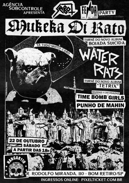 Mukeka di Rato, Water Rats, Time Bomb Girls e Punho de Mahin são as bandas que participam neste sábado (22 de outubro) do primeiro Sabot/Fenda 315 Party, uma realização da Agência Sobcontrole em parceria com a loja/casa de eventos da capital paulista. O evento de estreia, de uma série de muitos outros, acontece no clássico Hangar 110, com after no Fenda 315. O Agência Sobcontrole apresenta Sabot/Fenda 315 Party, a cada edição, terá shows, discotecagem, venda de merch e outras ações. Além disso, o local será sempre palco de um after do evento principal. O ingresso valerá para ambos os eventos da mesma noite. Na estreia da festa, os shows acontecem até 22h30 no Hangar 110 (e com discotecagem de Thiago DJ, Verônica Faxina, Franco Sabot e Diego Fenda) e o after será na Sabot/Fenda 315, a partir das 23h.