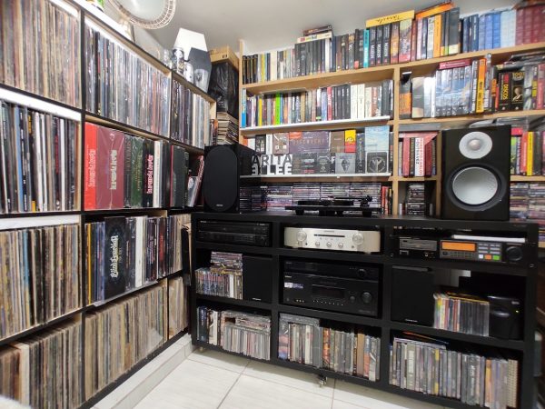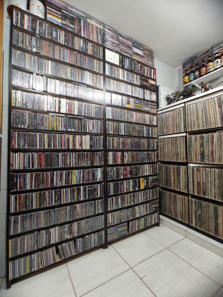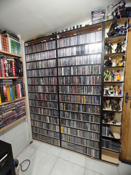 Minha coleção é constituída por CD´s, DVD´s, Livros, Actions Figures e Vinis, o foco maior sempre foi vinil, apesar da dificuldade e dos valores exorbitantes. Traduzida em números eu não conseguiria te dizer o número exato, mas posso afirmar que são cerca de 3.500 CD´s, 3.000 Vinis e um número infinitamente menor de livros, action figures e memorabilia de outras naturezas.