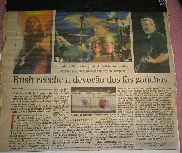 Lembro que, para mim, foi o mesmo que a realização de um sonho. Eu uma época pré-internet, onde a maioria das informações sobre música chegava até mim através, basicamente, das revistas Bizz (depois ShowBizz) e Rock Brigade, em 2002 eu já curtia o Rush há pelo menos 12 ou 13 anos, desde que um amigo conseguiu a discografia inteira da banda (na época, até o álbum Presto) com alguém, com a promessa de devolver os discos no dia seguinte àquele em que os havia pego, o que me fez passar boa parte de uma madrugada e uma manhã e tarde inteiras de 1989 ou 1990 gravando os discos em fitas K7 sem nem mesmo ouvi-los antes, indo “curtir” e “entender” os mesmos a partir das fitinhas, nos dias subsequentes (experiência que, até hoje, me faz ter um pouco de medo da introdução de “Witch Hunt”, faixa do disco Moving Pictures, depois de ouvi-la pela primeira vez às quatro da madrugada, nos fones de ouvido, num quarto escuro, com meu irmão dormindo ao lado e minha família em seus respectivos quartos, enquanto tentava manter o meu silêncio para não acordá-los, mesmo tendo experiências sonoras fascinantes à medida que a agulha percorria os sulcos de cada LP que ia para o toca discos… bons tempos…).