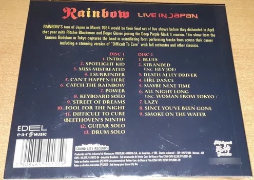 Os dois shows da capital japonesa foram gravados e filmados com a intenção do lançamento de um álbum duplo posteriormente, mas a Polydor, selo ao qual tanto o Rainbow quanto o Deep Purple estavam ligados à época, preferiu “segurar” o lançamento destes registro para não afetar aquilo que acreditava que viria a ser o “retorno triunfal” do Púrpura Profundo, lançado na forma do disco Perfect Strangers ainda naquele mesmo ano. Como disse, estas gravações só viriam a ser disponibilizadas oficialmente (e apenas no Japão, inicialmente) apenas em 2015, sendo que, hoje em dia, a versão do DVD é facilmente encontrada em sites como o Youtube, mas a versão remasterizada do áudio presente nestes CDs é bem superior à dos vídeos que encontrei, o que torna ainda mais atraente a aquisição deste lançamento, o qual, tanto pelo repertório como pela performance da banda, a qual, ainda que apareça no auge de sua fase AOR, aparentando estar tocando “com o freio de mão puxado” (até devido a saberem que aqueles concertos na Terra do Sol Nascente eram apenas “burocráticos”, com tudo acabando logo em seguida para a banda), sem a mesma empolgação e entusiasmo dos dias de Dio ou mesmo de Graham Bonnet, soando bem mais “contida” em relação às suas encarnações anteriores (sendo que mesmo Ritchie não arrisca muitos solos “incendiários” aqui como costumava fazer em outros tempos), ainda consegue soar empolgante e de audição extremamente interessante, o que acaba fazendo deste, pelo menos até agora, o melhor registro ao vivo de Joe Lynn Turner à frente do Rainbow já disponibilizado oficialmente no mercado. Se você gosta da banda, e especialmente desta fase do grupo, não deixe de conferir. Seus ouvidos lhe agradecerão, com toda a certeza!