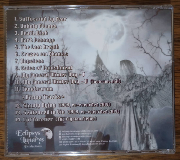 “The Last Breath” já começa de forma melancólica, tal qual seu título. Riffs bem cadenciados, andamento lento, vocais acompanhados de linhas bem interessantes de teclado tomam conta de toda a estrutura da música, nos levando a identificar toda a influência death/doom da banda. Letras em português entram em cena, abrilhantando ainda mais o trabalho, deixando-o obviamente único, comparado a bandas internacionais do mesmo estilo. “Cruzes em Chamas” se inicia de forma bem diferente e muito cativante. Uma bela introdução de teclada, acompanhada pelo baixo em destaque, criando o groove a ser acompanhado pela bateria. As letras novamente em português são outro grande destaque novamente, provando que o metal e particularmente o death/doom pode ser feito em português. A música também apresenta riffs bem inspirados no classic rock e NWOBHM em certos momentos, mostrando a capacidade criativa de Danilo, que deve ser destacado, pois executa muito bem a parte instrumental do trabalho.