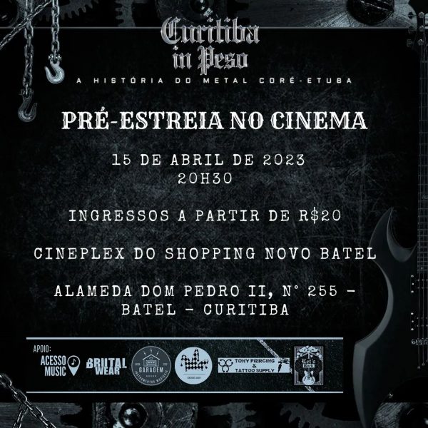 Após dois anos de muito trabalho e gravações, finalmente chega aos cinemas o documentário Curitiba In Peso – A História do Metal Coré-Etuba. O filme, com mais de três horas de duração, reúne dezenas de personagens importantes desse cenário musical, resgatando histórias dos primórdios do estilo, dos anos 1980, passando pelas décadas seguintes e traçando um amplo panorama do Metal na capital paranaense. A estreia oficial de Curitiba In Peso – A História do Metal Coré-Etuba acontece hoje, dia 15 de abril, às 20h30, em sessão no Cineplex do Shopping Novo Batel. Os ingressos custam 20 e 40 reais.