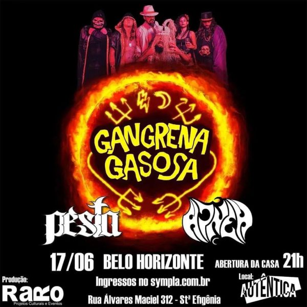 Uma verdadeira lenda da cena underground, a Gangrena Gasosa tem mais de trinta anos de estrada, contando com a seguinte formação: os vocalistas Angelo Arede (Zé Pelintra) e Davi Stermimiun (Omulu), com o baixista Diego Padilha (Exu Tranca Rua), a percussionista Ge Vasconcelos (Pombagira Maria Navalha), o guitarrista Minoru Murakami (Exu Caveira) e o baterista Alex Porto (Exu Tiriri). Representando o lado underground da expressão cultural brasileira, o grupo mescla metal e hardcore com elementos de Umbanda. Para acompanhar as novidades da banda, siga nas redes sociais.