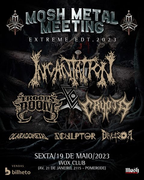O festival Mosh Metal Meeting será realizado no dia 19 de maio, na tradicional casa de shows Vox Club, em Pomerode/SC, um reduto do metal nacional, presente na agenda de grandes bandas do metal nacional e internacional. O evento tem como atração principal o grupo americano de death metal Incantation, que retorna ao Brasil com uma turnê que celebra mais de trinta anos de carreira. Também participam do Mosh Metal Meeting o The Troops of Doom, banda com membros que carregam um legado glorioso dentro do metal nacional e divulga o álbum de estreia, Antichrist Reborn; a Crypta, a nova sensação do Metal extremo, em uma das últimas datas da turnê do aclamado Echoes of the Soul; o melodic death metal do Sculptor e no Garden Stage, a one-man-band de brutal death metal, Divulsor.