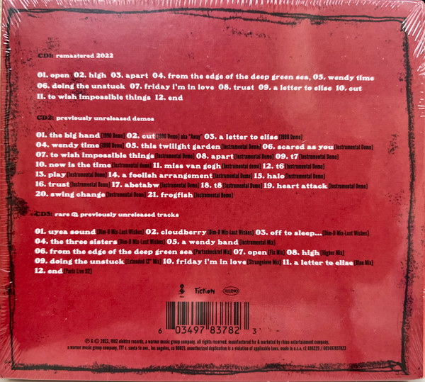 A edição de trinta anos do disco foi lançada em CD simples (“standard edition”) e em vinil duplo (nas versões preto e “picture”) remasterizados, todos com o mesmo track list da edição original, mas o formato mais interessante para os fãs é a edição em CD triplo, o qual agrega dois CDs com raridades e faixas inéditas registradas durante a confecção do álbum (surpreendentemente, todos os formatos saíram em edição nacional, pela gravadora Universal Music). O segundo CD desta edição tripla é bastante semelhante, em conceito, aos discos extras das edições “deluxe” lançadas entre 2004 e 2006, trazendo as quatro primeiras demos registradas pela banda para o disco (gravadas ainda em novembro de 1990, no estúdio The Live House, portanto bem antes do grupo se mudar para o Manor Studios em Oxford em setembro de 1991 junto do produtor Dave Allen e o engenheiro Steve Whitfield para as gravações do disco), demos instrumentais para faixas que depois ou entrariam no álbum (“To Wish Impossible Things”, “Apart”, “Trust”) ou seriam lançadas como B-sides nos citados singles do disco (“This Twilight Garden”, “Scared As You”, “Play”, “A Foolish Arrangement” e “Halo”), além de demos para nove canções totalmente inéditas até então: as lentas e densas “t7” e “Abetabw”, as agitadas “Heart Attack” e “t6” (esta, levada pelo wah wah), as mais voltadas ao pop “Now Is The Time”, “Miss Van Gogh” e “t8”, a calma e suave “Swing Change” e a surpreendente “Frogfish”, faixa considerada no encarte como “funky” por Smith, e que conta com um ritmo suingado e a presença de um saxofone ao longo de sua duração, o qual não está explicitado quem o toca, mas acredito ser Porl, que tocou o mesmo instrumento no disco The Top (sobre as faixas com nomes “t” mais um número, Robert explica no encarte que era assim que nomeavam as demos trazidas por Perry, que tinha o apelido interno de Teddy na banda. Bob ainda diz que as demos de Simon também eram nomeadas “s” mais um número, mas que, como o baixista dava a elas seus próprios nomes, elas acabaram virando faixas como “Miss Van Gogh”, “Now Is The Time” ou “Abetabw”). Todas as faixas foram compiladas por Smith, que declara no encarte que o grupo “tinha quase quarenta ideias para trabalhar no disco quando chegou ao Manor”, e que “haviam quase trinta faixas realmente muito boas que eu poderia ter escolhido (para esta edição), faixas que nos possibilitariam ter construído várias versões diferentes daquela em que Wish resultou”.