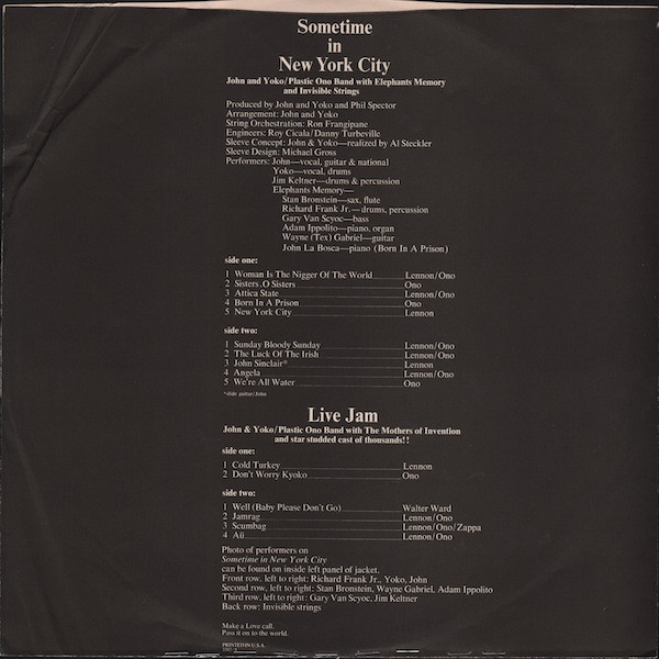 O disco ao vivo tem lá sua dose de controvérsias. No LP original, o lado A traz duas músicas gravadas num show para a Unicef em 15 de dezembro de 1969, com a participação de George Harrison, Eric Clapton, Delaney & Bonnie, Jim Gordon, Bobby Keys, Alan White, Keith Moon, entre outros. A versão de “Cold Turkey” é muito boa, profundando o desespero da original. “Don’t Worry Kyoko” é um problema; se, por um lado, a jam instrumental é boa, por outro tem-se que aguentar a gritaria de Yoko. Gostaria de ter uma oportunidade de ouvir a música com o vocal dela apagado… De todo modo, ainda acho a parte instrumental aqui mais interessante do que a versão em Live Peace in Toronto. Mas não critico quem não ouvir a música toda.